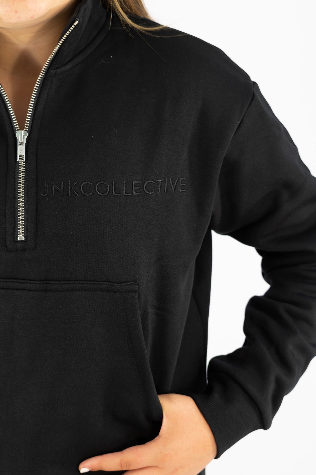 Wrap yourself in comfort with the Luna 1/4 Zip Sweater. Crafted from soft, cozy material, this piece features an embroidered JNK COLLECTIVE logo and a relaxed fit that moves with you. The slightly cropped silhouette pairs perfectly with high-waisted bottoms, while an inspiring motivational message adorns the cuff as a daily reminder. Finished in classic black with a matching black logo for understated style.
