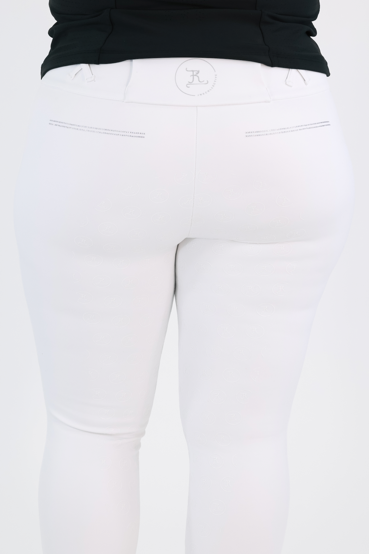 These Competition Breeches in Diamond Snow White are impeccably crafted to enhance confidence while delivering superior support and comfort. Featuring an inner lining to ensure opacity, the four-way stretch fabric effortlessly follows your movements, complemented by a high waist for added support. Advanced moisture-wicking technology keeps you cool and dry, while three thoughtfully placed pockets offer convenient storage. Distinguished by a refined silver back pocket logo and the signature Round JnK gel seat, these breeches embody elegance and performance for the dedicated equestrian.